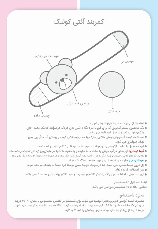 کمربند آنتی‌کولیک roseborn با طراحی حرفه‌ای و متریال ایمن، راه‌حلی طبیعی، ساده و بی‌خطر برای تسکین ناراحتی‌های شکمی نوزادان فراهم کرده. این محصول با قابلیت استفاده به صورت گرما درمانی و سرما درمانی، یک انتخاب کاربردی برای آرام‌سازی بدن کودک شماست — از دل‌پیچه گرفته تا بعد از واکسن!