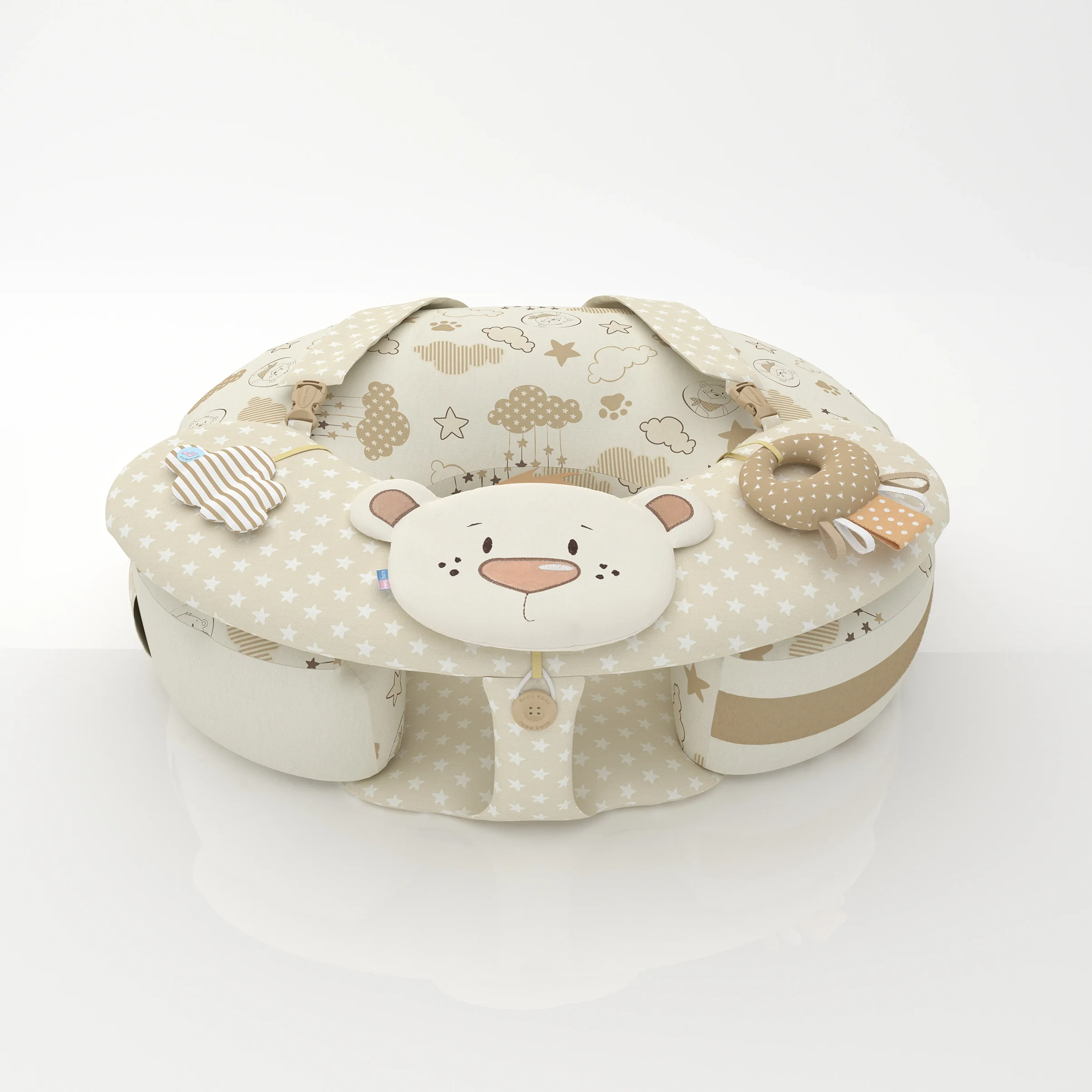 حالت صندلی کودک بالشcرُزبُرن، با قابلیت تکیه گاه کودک ، علاوه بر محافظت از صحیح نشستن کودک شما، کمک به پرورش حس های حرکتی و خلاقیت نیز می کند. از جمله وسایل استفاده شده در این محصول می توان به یک عدد عروسک پولیشی نرم و لطیف با کیت  موزیکال، یک آینه مخصوص کودک و یک عروسک پولیشی صدادار که بصورت ریلی روی سینی متصل شده اند اشاره کرد. لذا برای هرچه بهتر مهارت آموزی کودک از سنین پایین، این محصول بهترین انتخاب می باشد.
