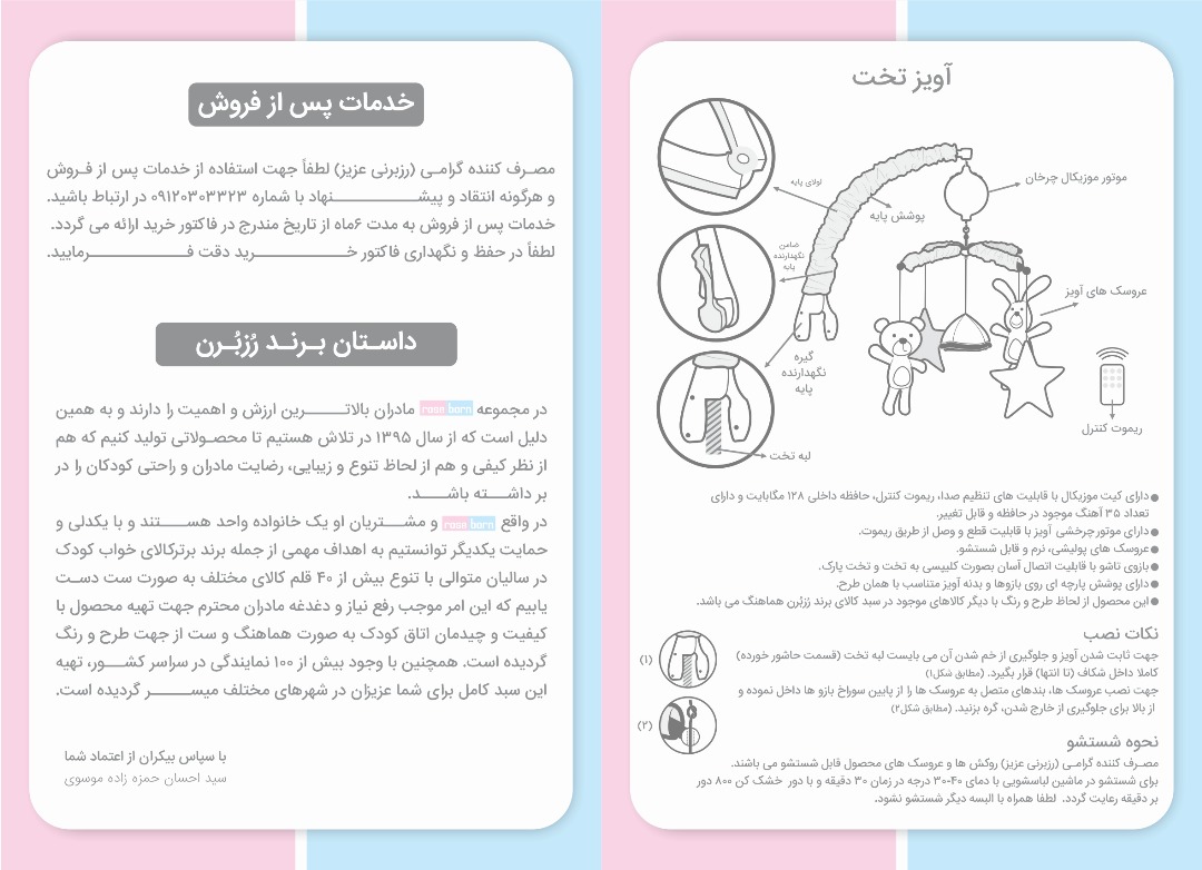 *روکش ها و عروسک های محصول قابل شستشو می باشند.برای شستشو در ماشین لباسشویی با دمای 40-30 درجه در زمان 30 دقیقه و با دور خشک کن 800 دور